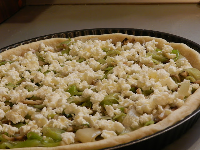 Dupa 10 min. scoatem aluatul copt de jumatate si punem ciupercile si prazul .